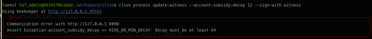 (venv) haf_admin@b6391f0e3dad:/workspace/clive$ clive process update-witness --sign-with witness-000_key Using beekeeper at http://127.0.0.1:38553 ╭─ Error ───────────────────────────────────────────────────────────────────────────────────────────────────────────────────╮ │ Communication error with http://127.0.0.1:8090: │ │ Assert Exception:operations.size() > 0: A transaction must have at least one operation │ ╰─────────────────────────────────────────────────────────────────────────────────────────────────────────────────────────── -