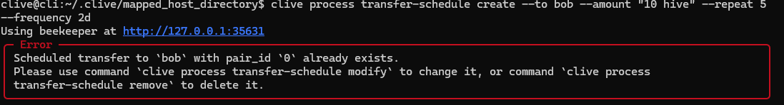 If you want to modify an existing one, use `clive process transfer-schedule modify`.