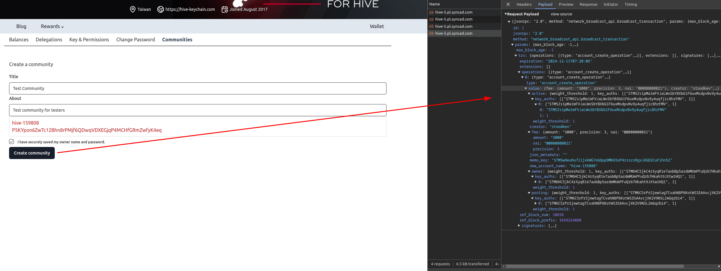 In Denser wallet-transactions creating community send only one request creating account as in the screen below.