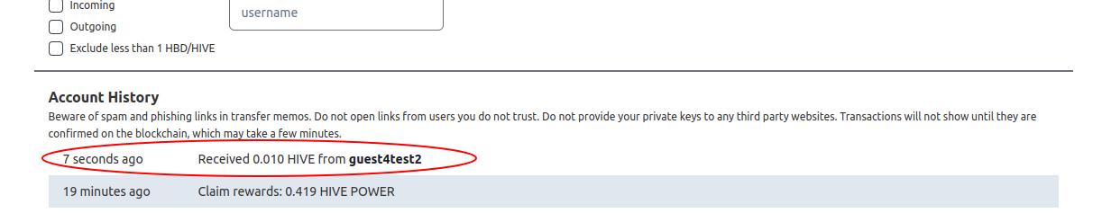 Now transfer from the muted user is visible in the transfer history. Expected message of muted user transfer: Received 0.011 HIVE from Muted User (i.e. change name + memo)